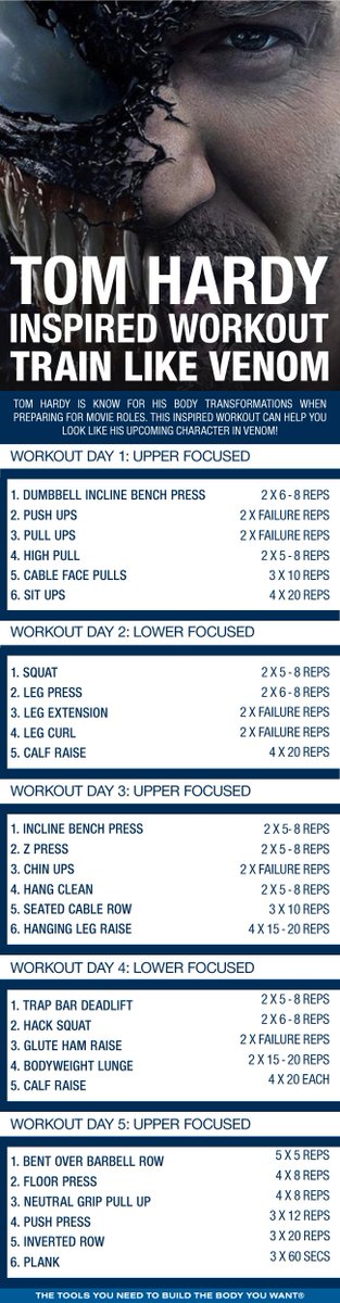 Tom Hardy is known for his body transformations when preparing for movie roles. This inspired workout can help you look like his upcoming character in Venom! FREE PDF: https://muscle.ms/Venom pic.twitter.com/7z2XAjdUcc
